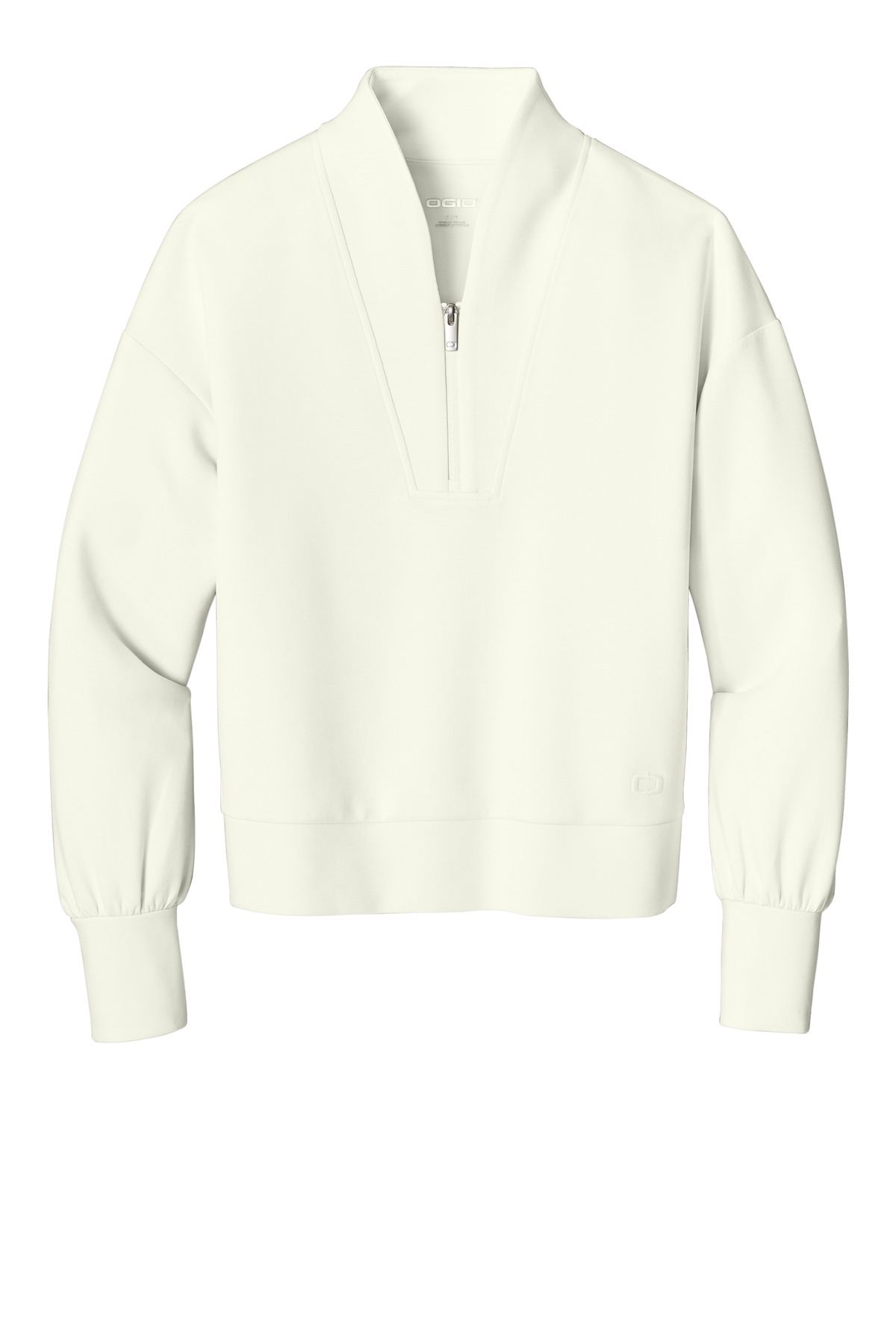 OGIO Women's Transcend 1/4-Zip LOG861Perfectly polished, this elevated, sueded 1/4-zip performs with stretch and transcends the line between work and leisure.,9.1-ounce, 50/44/6 rayon/recycled poly/spandex double knit fleece,OGIO heat transfer label for tag-free comfort,Shawl collar,Reverse coil zipper with debossed, brushed silver O icon pull,Drop shoulders,Forward side seams,Blousing detail at sleeves,Banded cuffs and hem,Embroidered O icon on left hem